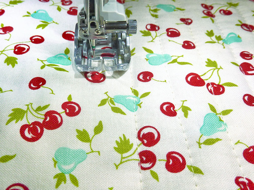 NOTE: If you’re brand new to quilting, we have a five-part series that covers the basics. - Thread the machine with thread to best blend with the print fabric in the top and with the lining fabric in the bobbin. We used ivory thread in both. Slightly lengthen the stitch.