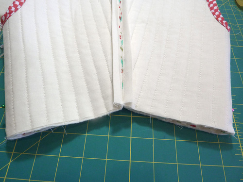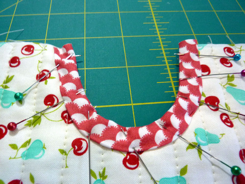 - Wrap a bias binding strip over the raw edges of each cutaway, easing around the curve. Pin in place. Trim any excess binding so the raw ends of the binding are flush with the top raw edge of the quilted panel.