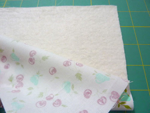 - Place the pocket panel wrong side up on your work surface. Align the batting panel at the top of the fabric panel. Fold the bottom of the fabric panel up so the fabric panel is now folded in half and the batting in sandwiched between the layers.