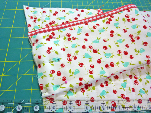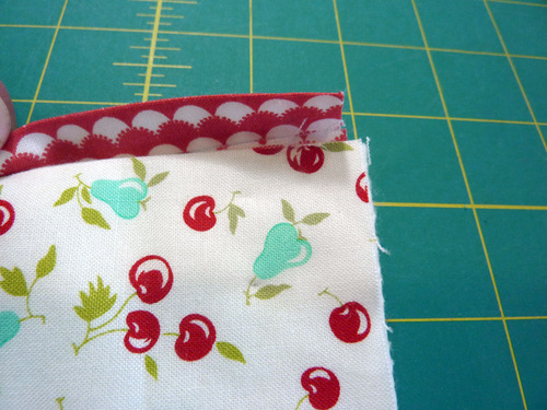 - Slip the shorter length of binding over the top raw edges, capturing all three layers within the binding’s folds.