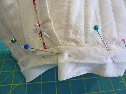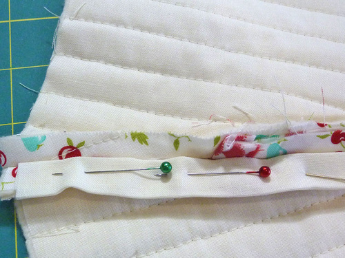 - At the cutaway, continue to place a few pins along the remaining length of just the binding itself where it extends beyond the fabric panel, creating the free ends of the ties.