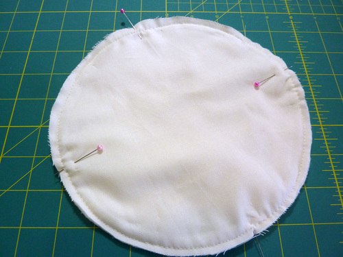 - Make a quilt sandwich with the three base circles as you did above with the main panels: lining, batting, print – with both the lining and the print facing right side out.