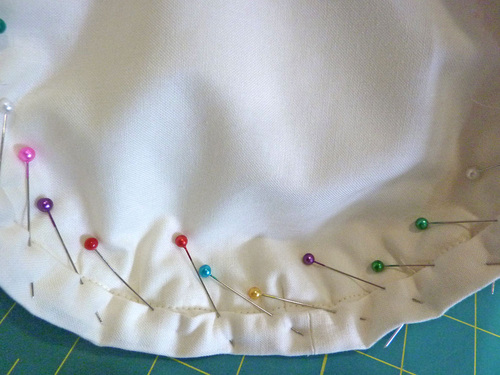 - Find the assembled main panels. This “tube” should be lining side out. Find the four quarter points of the bottom of the tube. Set the base into the tube, aligning the quarter points. Then fill in with pins all around.
