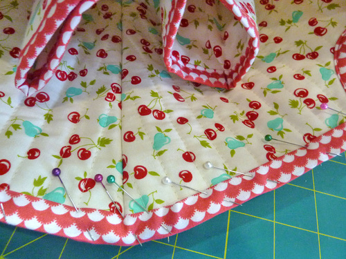 - Line up this center point on one length of binding with one of the basket’s side seams. With these points aligned, slip the binding in place over the top raw edges of the panel. Pin in place from the center out to each side until you get to the cutaways.