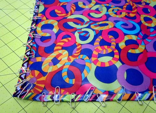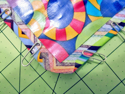 - When all four side edges are clipped in place, fold in each corner so the diagonal edge of the corner just covers the corner point of the front fabric. Clip in place.