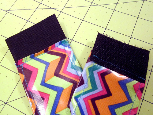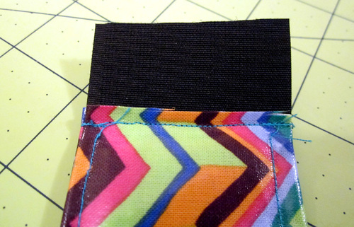 - On the opposite end, the hook side of the Velcro® will be on top of the laminate, overlapping it by ¼”. Stitch across this end through all the layers.