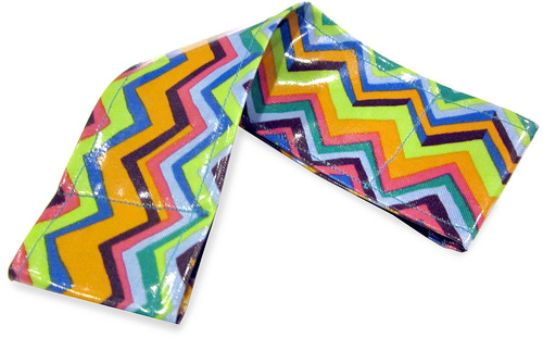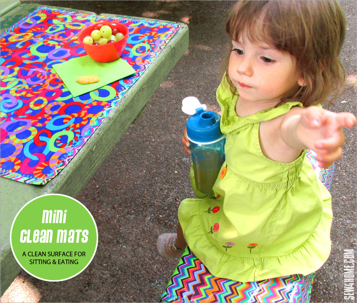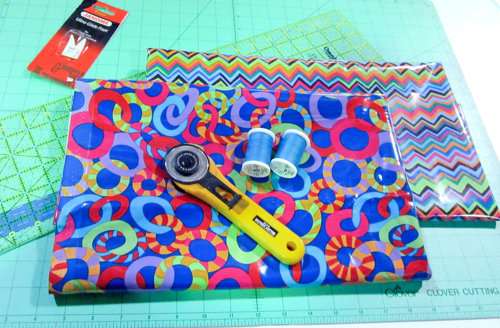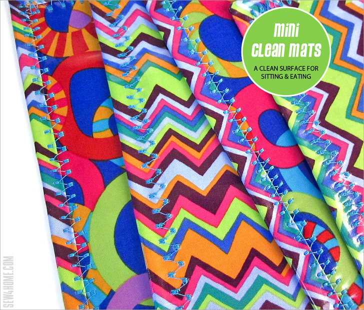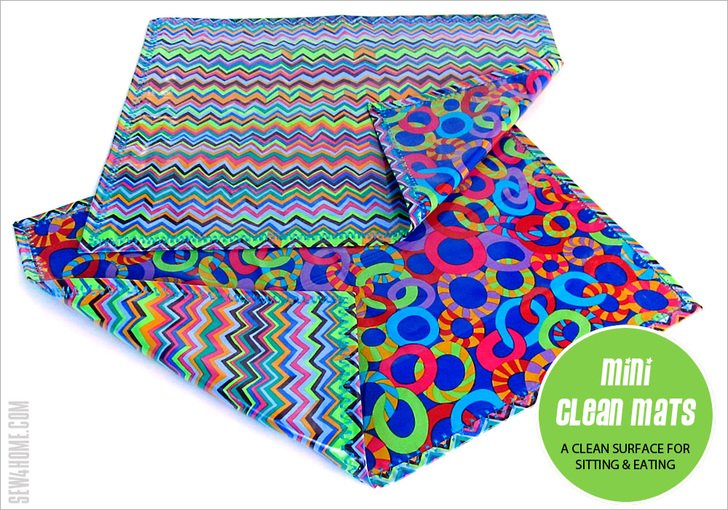 Each mat uses just two layers; the binding is a self-wrap. The fabric itself a medium weight so no additional stabilization is really necessary. Plus, laminates and oilcloth have a certain amount of inherent “grippiness” so once you’re sitting on the mat, it won’t slide around. The finished mats are flexible and easily roll-up to stash in a glove box or bag.