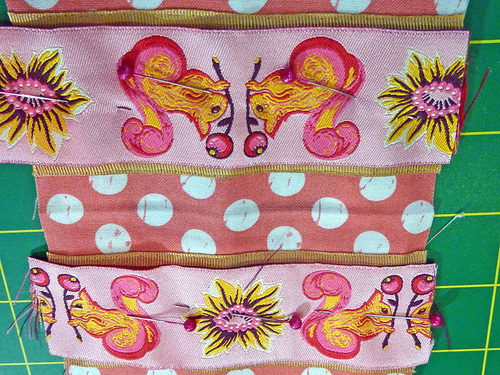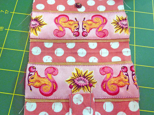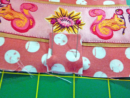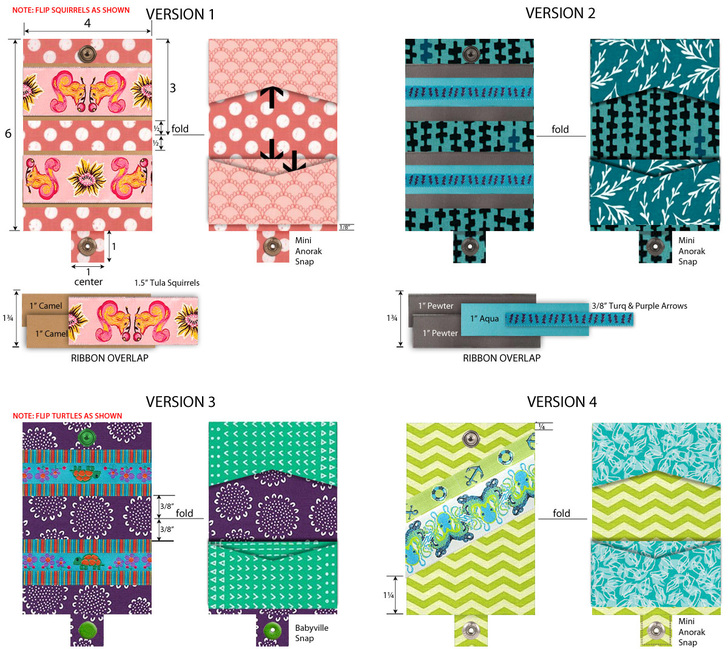NOTE: If you have a directional ribbon, such as our adorable Tula Pink Squirrels, pay particular attention to the placement of your two featured ribbons. As shown in the drawing above and the photo below, the feature ribbon at the “bottom” (where the snap tab extends) is right side up; the feature ribbon at the “top” is upside down.