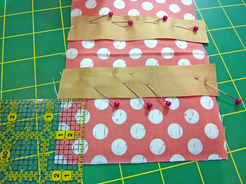 - Pin the tab into position at the bottom of the panel. The tab should be centered side to side and the raw edges of the tab should be flush with the bottom raw edge of the panel.