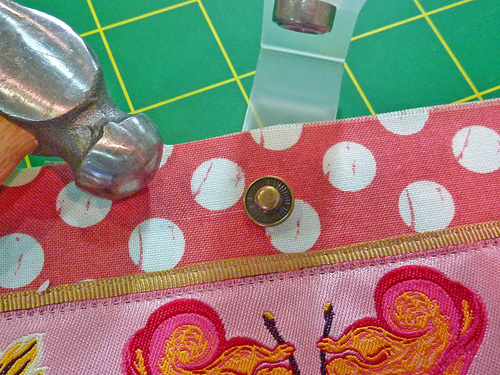 - You may want to consider switching to a Zipper foot in order to better insure you can easily stitch past the top snap top.