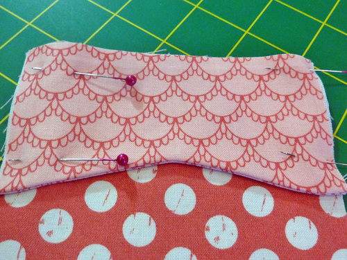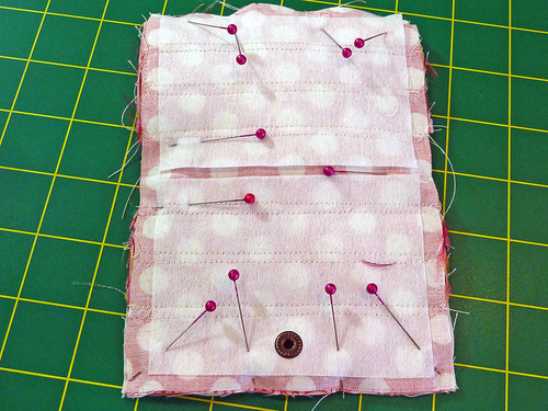 - Pin the front and back panels right sides together, sandwiching the pockets between the layers. Remember, the bottom snap tab should also be sandwiched between the layers. The front and back panels should be flush all around. Pin in place, leaving a small opening along the center of one side for turning.
