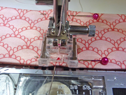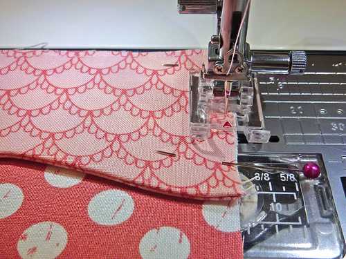 - Baste in place along the sides and bottom of the pocket, staying very close to the raw edge – remember, it’s just a ¼” seam allowance to finish.