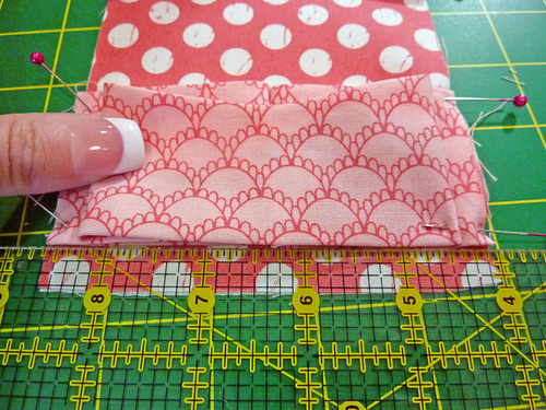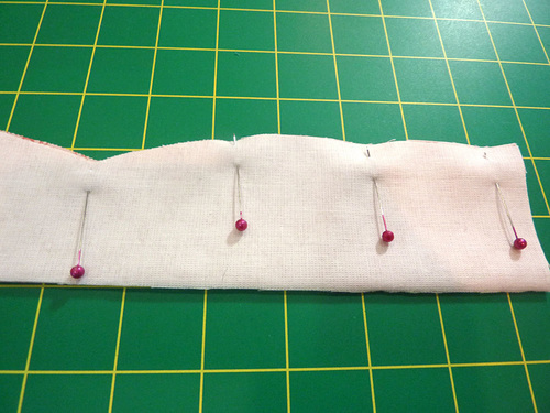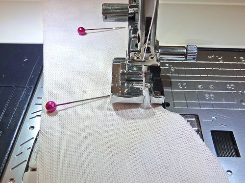 - Double check that the bottom folded layers are still parallel to and ⅜” up from the bottom raw edge of the fabric panel. Pin the bottom edge in place.