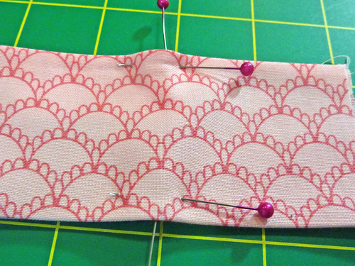 - Fold the fused panel in half, right sides together, and pin along the top edge only (the long raw edge with the “V” notch).