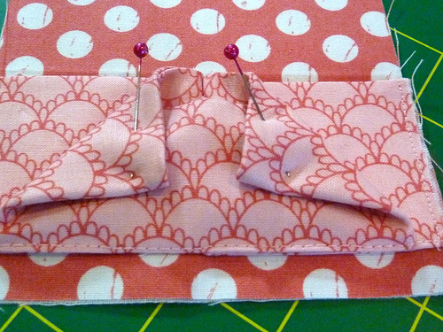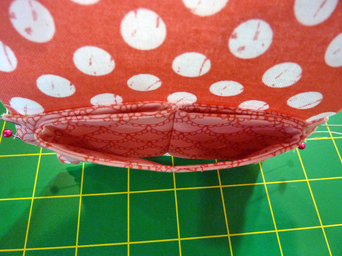 - Fold in and pin each side of the front accordion pocket in order to keep it out of the way of the final perimeter seam. The bottom corners are secured, but the sides should be completely free and so can easily be folded out of the way.