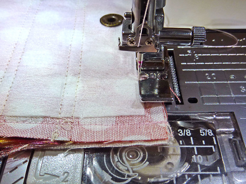 - Staying very close to the edge, baste each side edge of the pocket in place. You can see we folded the front out of the way of this basting.