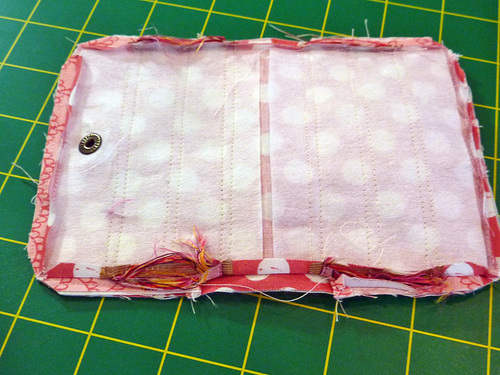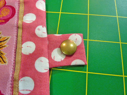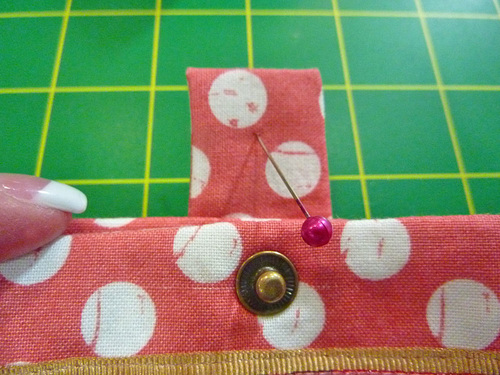 - Push out the corners with a long blunt tool to insure they are as sharp and square as possible. Un-pin the front accordion pocket. Pull the snap tab out and down into position. Press super flat, pressing in the raw edges of the opening so they are flush with the sewn seam.