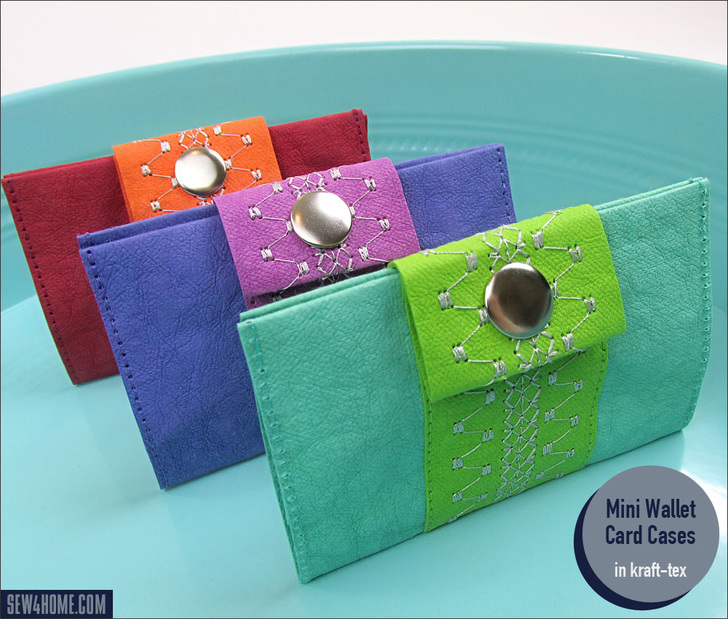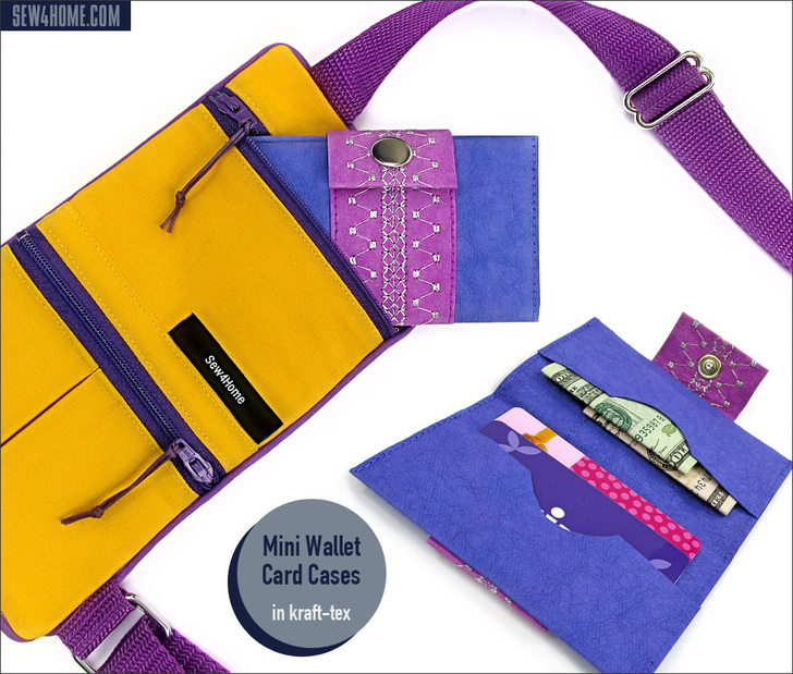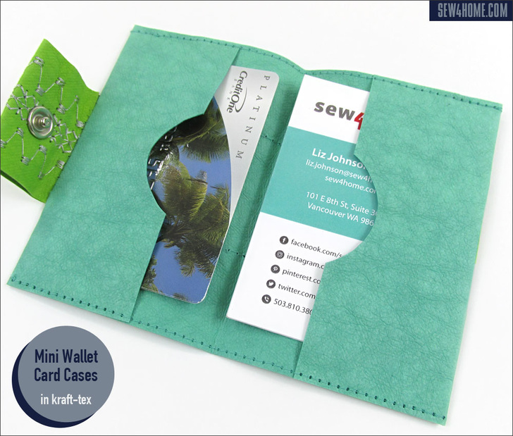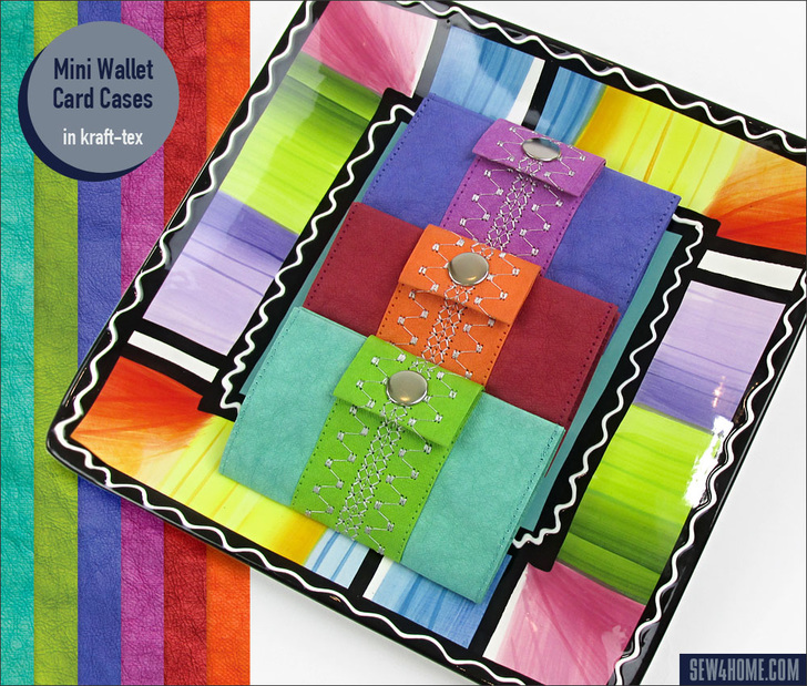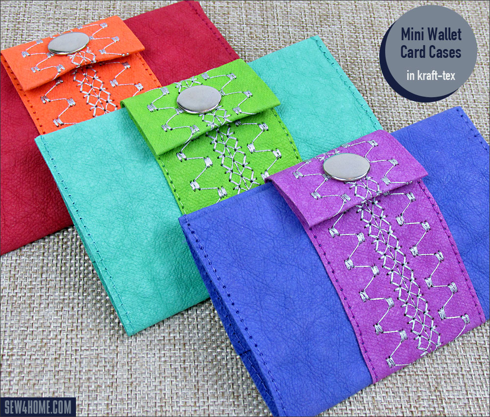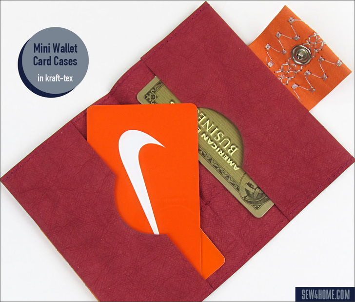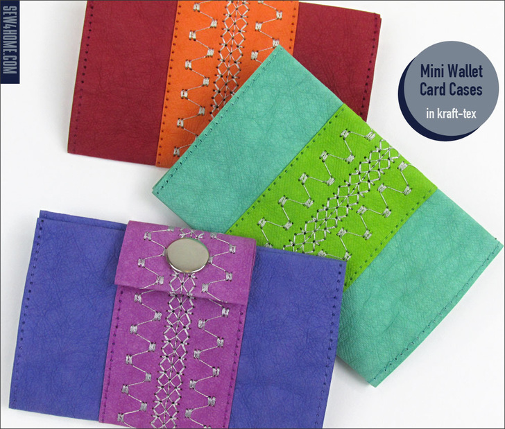 Somewhere between paper and felt lives a versatile and interesting substrate called Kraft-Tex – a paper product that washes, cuts, and sews like fabric, but looks and feels like leather as it softens and wears. It comes both in vibrant colors as well as muted naturals. These Mini Wallet Card Cases are a fast and easy project and a great introduction to working with Kraft-Tex. We link to their store on Amazon, but you may also be able to find it at your local craft store.