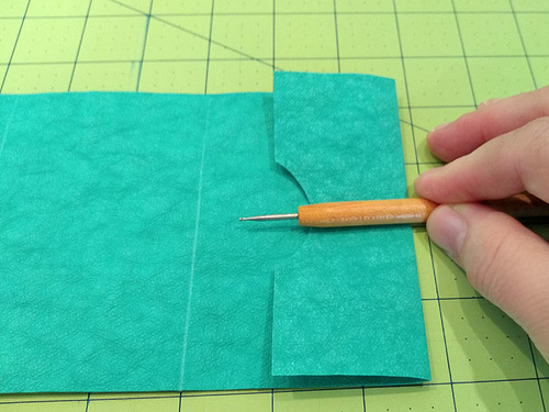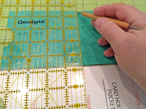 To make the crisp fold lines needed for the card cases, we used a paper embossing tool. This tool is most commonly used in paper crafting along with a stencil to create a raised surface, but the small ball tip is also great for scoring a straight line without any worry about cutting or tearing the surface of the Kraft-Tex. To complete the fold, the side of the embossing tool is perfect for setting a final crease.