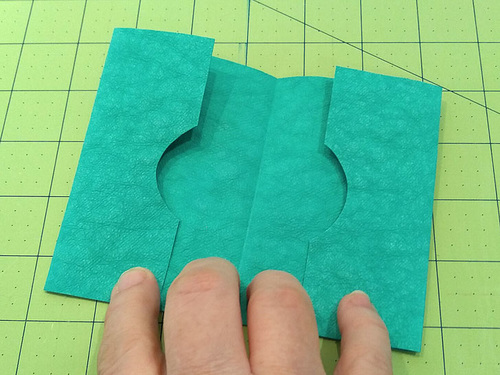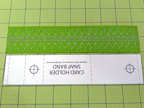 - Transfer the fold lines from the snap band pattern piece to the stitched snap band in the same manner as you did above for the main body piece. Place the pattern and the Kraft-Tex side by side. The ends of the snap band will extend beyond the pattern piece on each end. Center the band to best feature the stitching, then trim each end with a rotary cutter to match the length of the pattern piece.