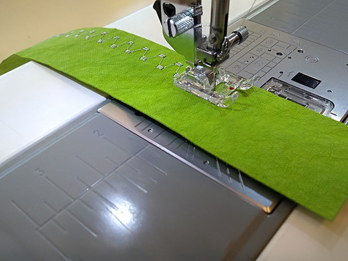 - Stitch one outer row to start. We used Heirloom Stitch 12 on each side of our snap band strip. Using the edge of the foot as a guide, edgestitch the length of the strip.