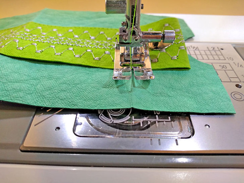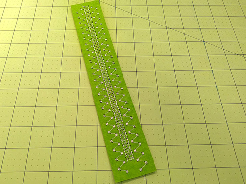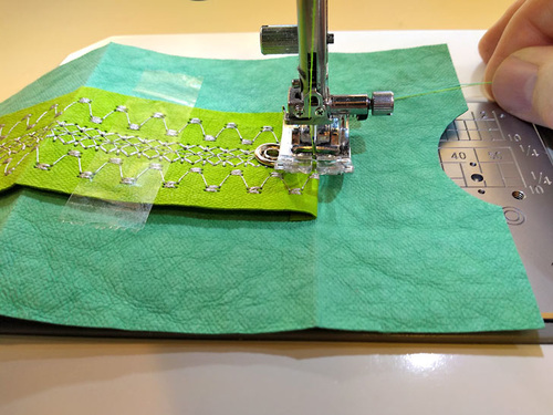 - Switch to your center stitch selection; we used Heirloom Stitch 04. Center the foot between the two outer rows of decorative stitching and sew the length of the strip.