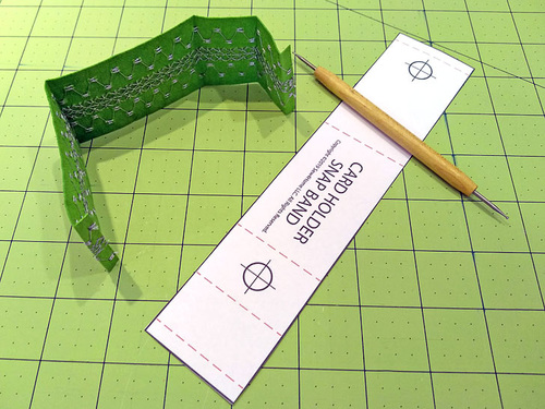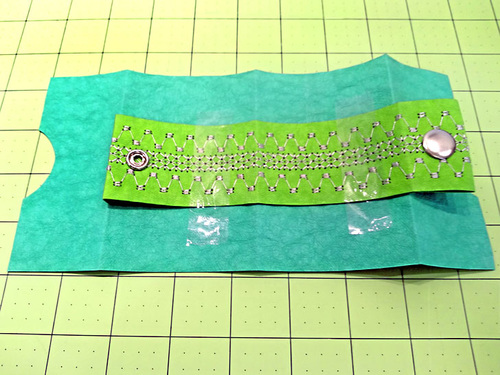 - As above, fold at each scored line, then crease using the side of the embossing tool. Notice that one end of the band is folded in the opposite direction. This end is part of the tab for the decorative side of the snap.