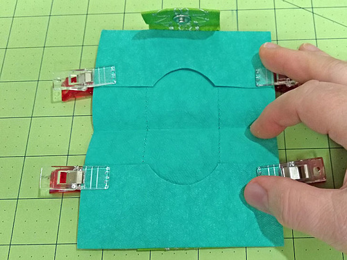 - Once the decorative snap band is stitched, you can fold the pockets into place. Use sewing clips or paper clips to hold the layers in place.