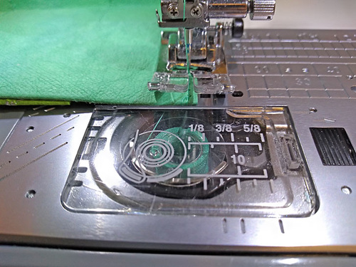 - Re-thread the machine with thread to best match the accent band in the top and to best match the main body piece in the bobbin. We re-set for a slightly lengthened straight stitch (3.0mm). You’ll remove the tape as you sew.