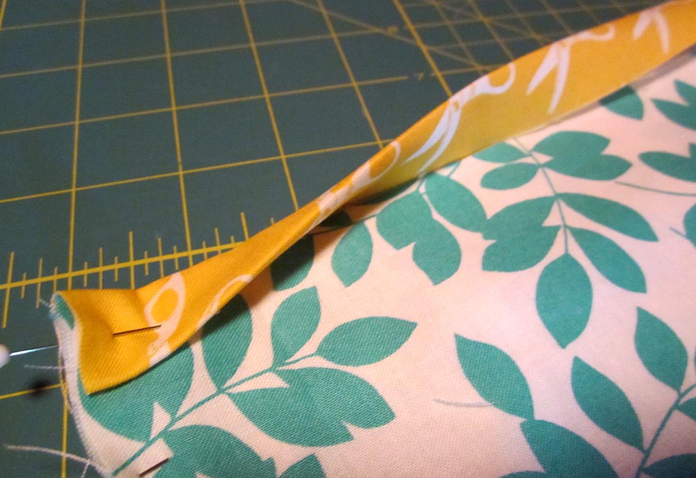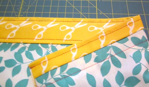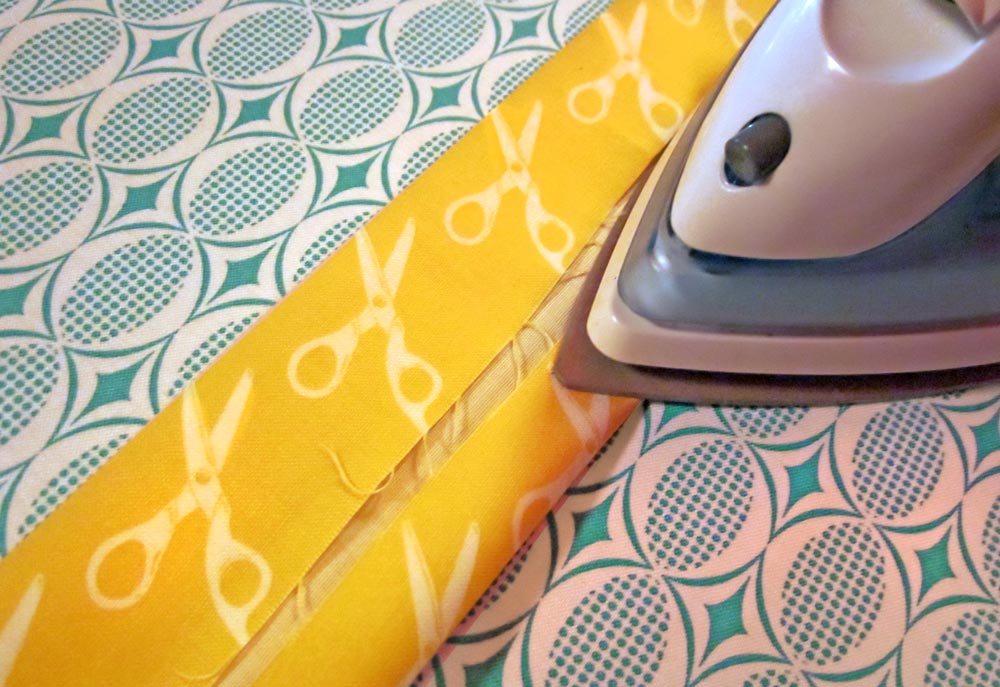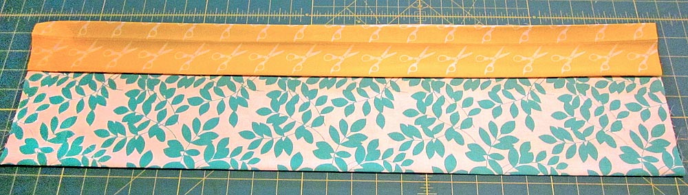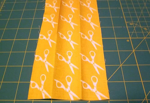 - Fold under both raw sides of the strip to perfectly center the middle motif. You need to do this visually – don’t rely on just measuring. Printed fabric is not always 100% straight. This is simply a hazard of printing on fabric, which can stretch and move slightly during the printing process. Rely on you eye to achieve a nicely centered middle motif.
