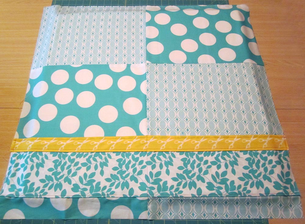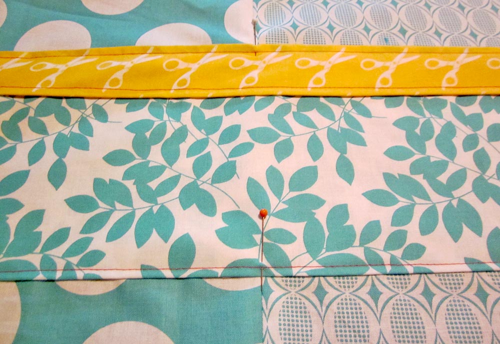 - From the fabric for the top-of-the-pocket accent strip (Scissors Yellow in our sample), cut ONE piece 28″ x approximately 4½”