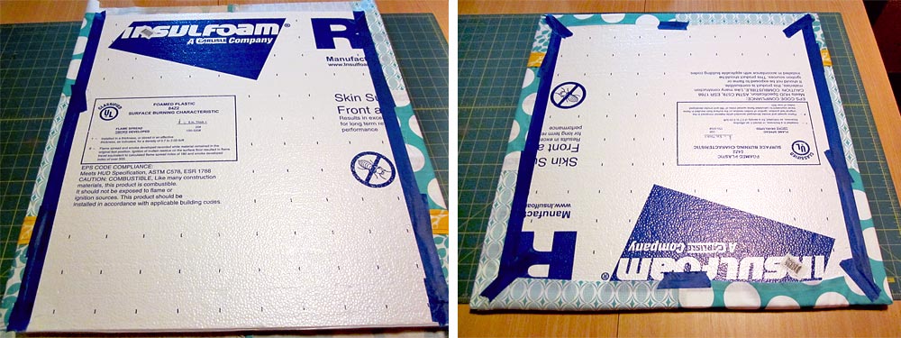 NOTE: You could also use the spray adhesive to hold the edges in place, but I found the tape easier to work with by myself. If you are doing this with a partner, the spray and pull and wrap option might be easier. - To get a nice smooth and even wrap, it is important to wrap in order. I did: side, side, top, bottom. You could also do: top, bottom, side, side. Do NOT try to go out of order: bottom, side, top, side or you are likely to pull the front fabric out of square.