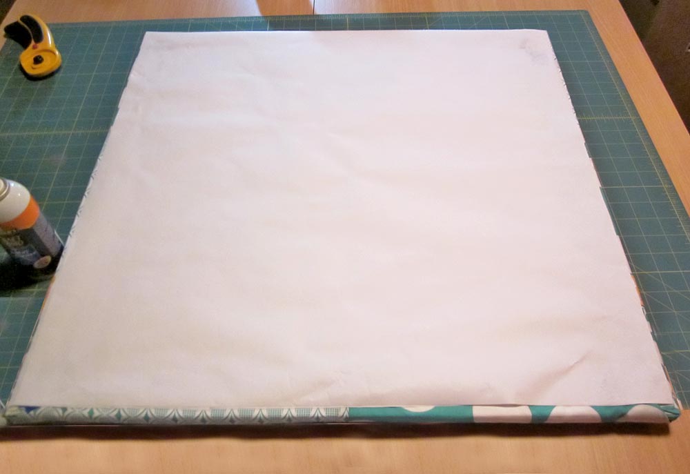 NOTE: You don’t have to spray the batting/flannel with adhesive – these fabrics have a “grippy” surface and a taut wrap around to the back is enough to keep the front fabric in place. Skipping the adhesive under the decorative fabric also helps insure a smoother finish.