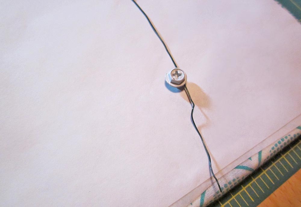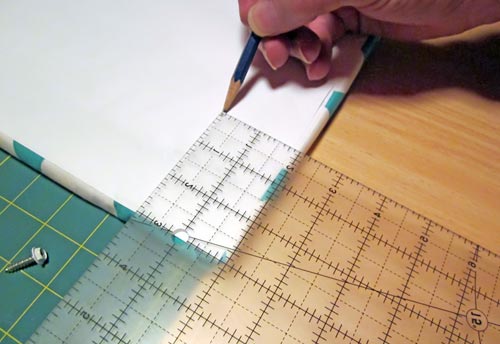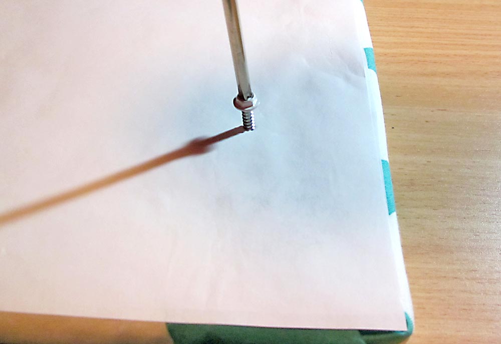 - Screw a small screw in place at each mark. The foam board is easy to drive into, but go slowly. Insert the screw until it just hits the batting layer of the front.