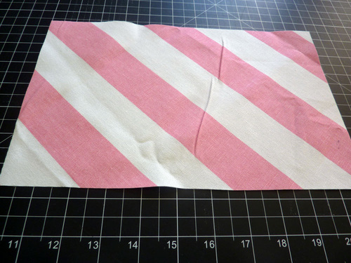 - Cut ONE 7″ x 11″ rectangle from the 54″ Canopy Stripe in Baby Pink, on the bias.