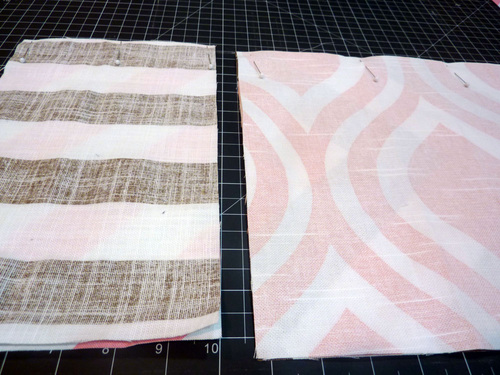 - Place the Left Top piece (Canopy Stripe in Drew Italian Brown) and Left Bottom piece (Canopy Stripe in Baby Pink) right sides together, aligning them along their center 7″ raw edges. Pin in place.
