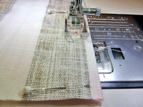 - Place the sewn left panel right sides together with the sewn center panel, aligning their interior 21″ raw edges. Pin in place.