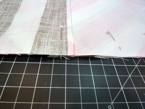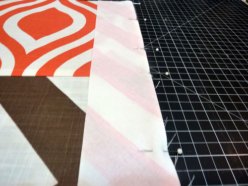 - Find the final piece for the pillow top, the long strip for the right edge (Canopy Stripe in Baby Pink). Place it right sides together with the completed left side, aligning aligning their interior 21″ raw edges. Pin in place.