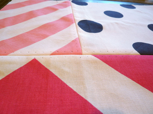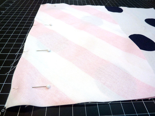 - Place the Left Top piece (Canopy Stripe in Baby Pink) and Center Top piece (Oxygen Dots in White/Navy) right sides together, aligning them along their interior 11″ raw edges. Pin in place.