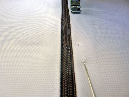 - Find the zipper. Place the folded edge of each piece along either side of the zipper. This folded edge should be close to the zipper teeth – about ⅛” from the teeth on either side Pin both sides in place.