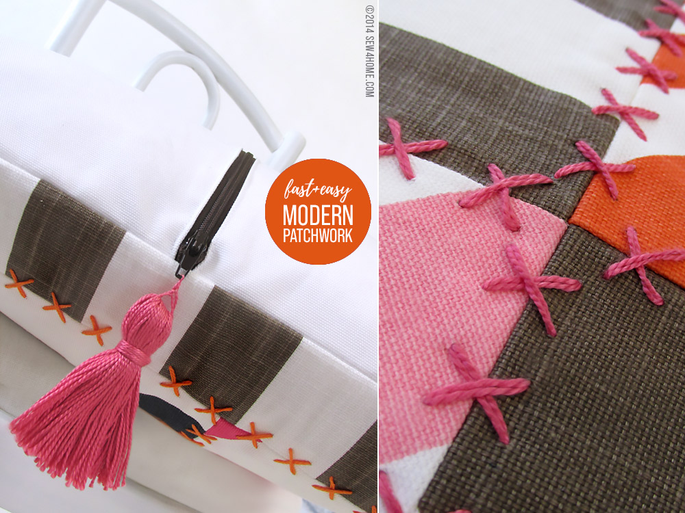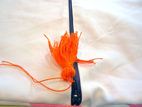 We love the backs of these pillows, which feature horizontal accent zippers in a strong color. We used brown zippers then added a bouncy tassel, also handmade from embroidery floss.