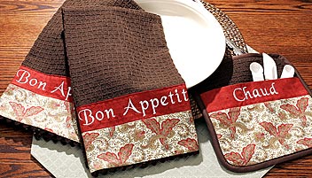 For now, you might start things off by going around the house selecting items crying for a monogram. Maybe it’s time to spruce up the towel set in the bathroom, personalize some napkins for an upcoming dinner party, or create one-of-kind holiday gifts for family and friends. Once you start, you’ll find places to put those initials and words everywhere!