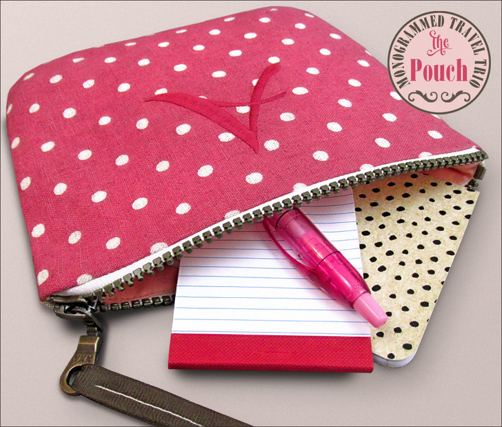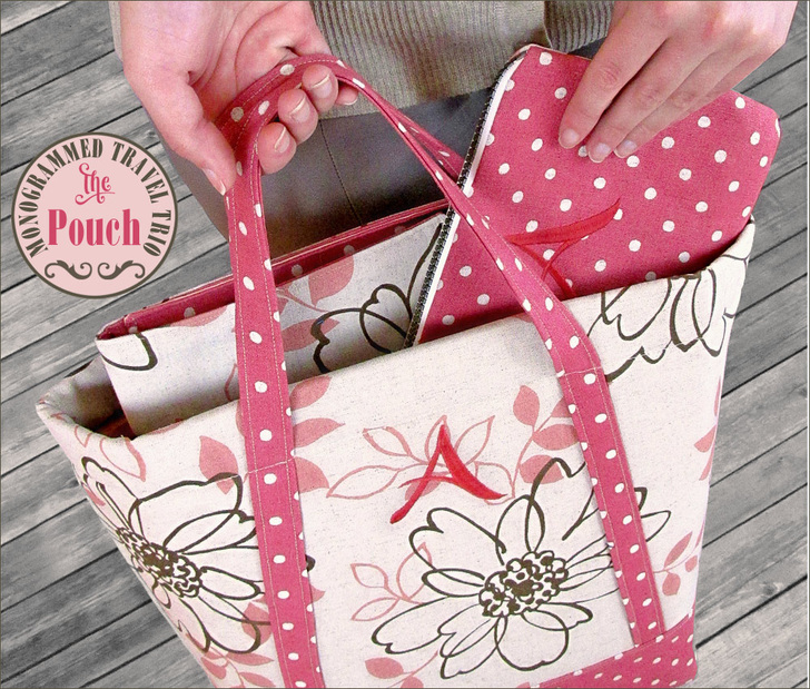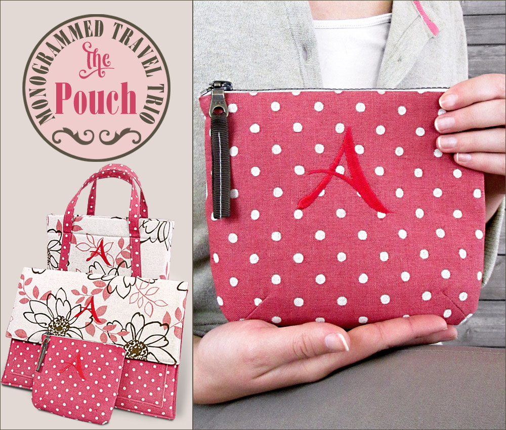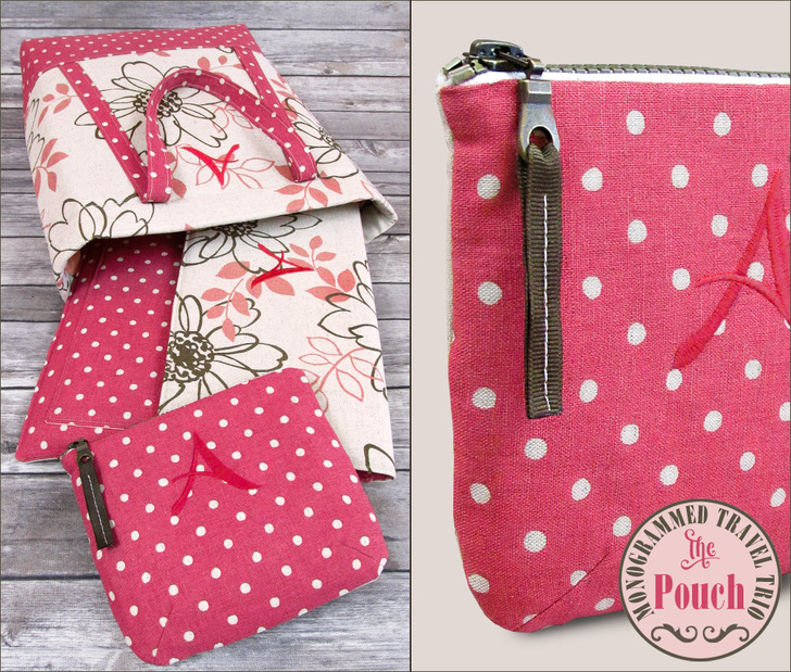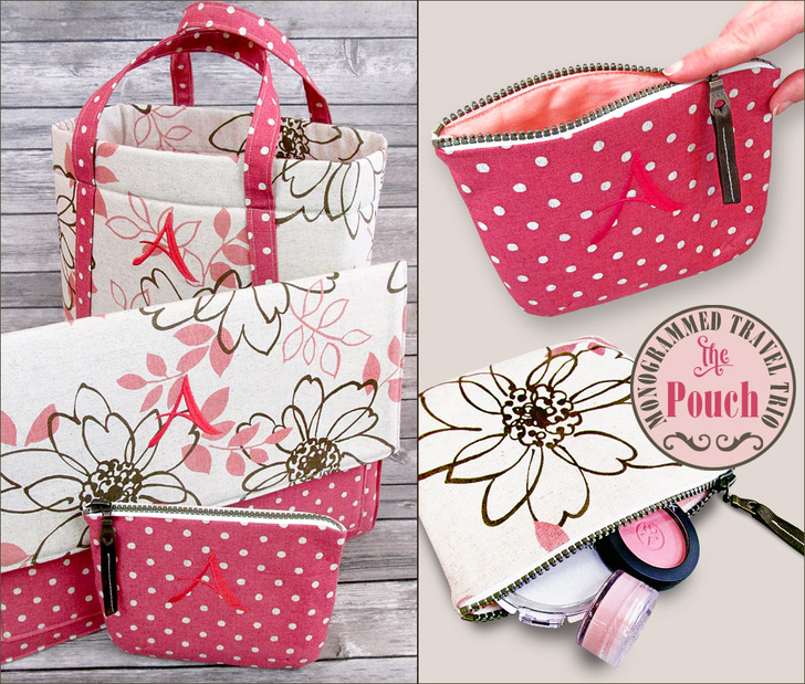 This pretty pouch is part of the Travel Trio we made using the Janome Skyline S7 for sewing and the embroidery-only Janome Memory Craft 500E to add a stylish initial to each piece. Make the entire matched set or create each one individually.