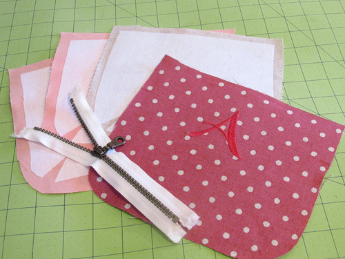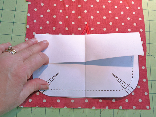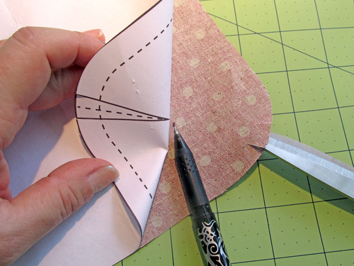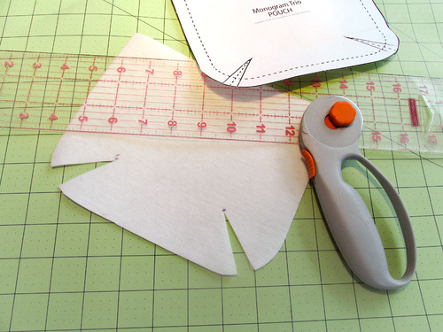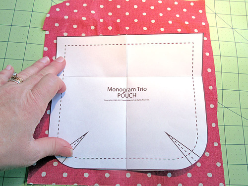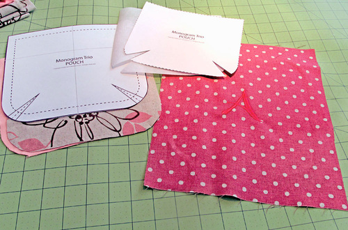 - From the fabric for the front of the pouch (the Rose Dot in our sample), use the pattern to cut ONE.