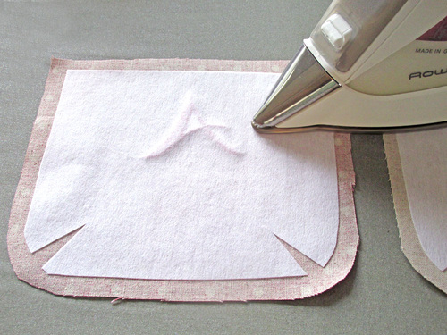 - Place an appropriate interfacing panel on the wrong side of each fabric panel. The interfacing should be positioned so there is ½” of fabric extending beyond the interfacing on all sides. Following manufacturer’s instructions, fuse in place.