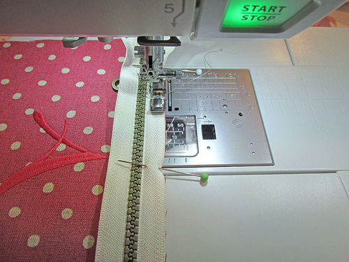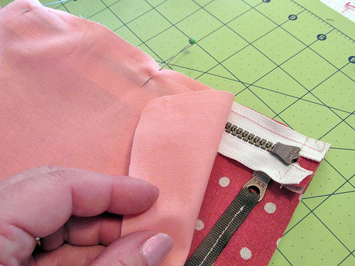 - Pin the zipper in place across the top, double checking that the zipper and the panel are right sides together.