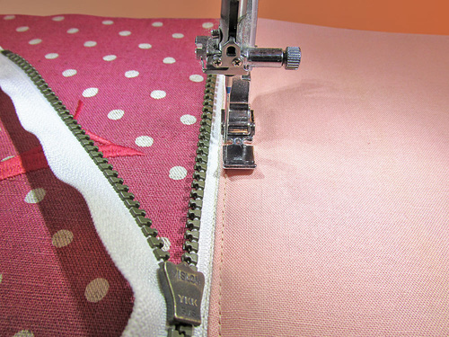 - Topstitch along the zipper on just the lining side. Remember to move the zipper pull out of the way so you can maintain a straight seam.