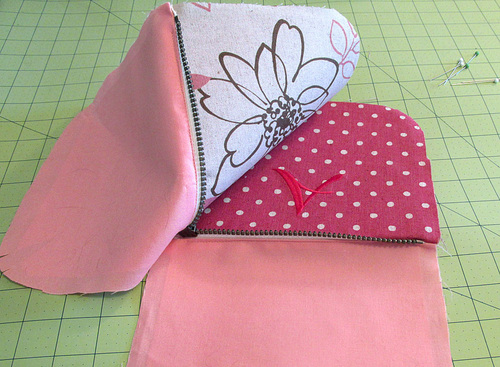 - Flatten the two sides of the pouch again – exterior to one side of the zipper, lining to the other side. Open up the zipper.