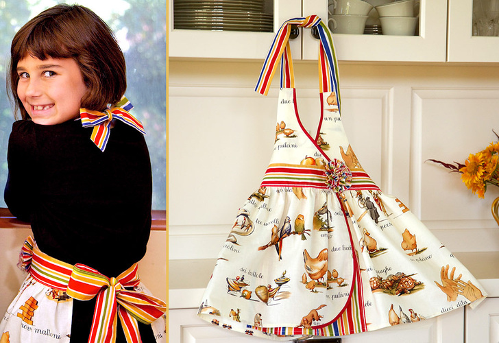 Our aprons were originally inspired by the fitted yet flouncy dresses Sophia Loren wore in her wonderful movies from the 1960s. We combine a lovely wrapped bodice with a full, peek-a-boo skirt and a tattered flower accent at the waistband. It’s sophisticated yet fun at full-size for Mother, and is cute-as-can-be in a mini version for Daughter.