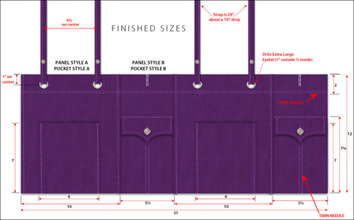 - You now have four panels sewn in a row: A – B – A – B. The drawing below shows the bag completely finished in a flat perspective. Obviously you don’t have the top portion done at this point, but the drawing is helpful to allow you to visualize the panel/pocket sequence.